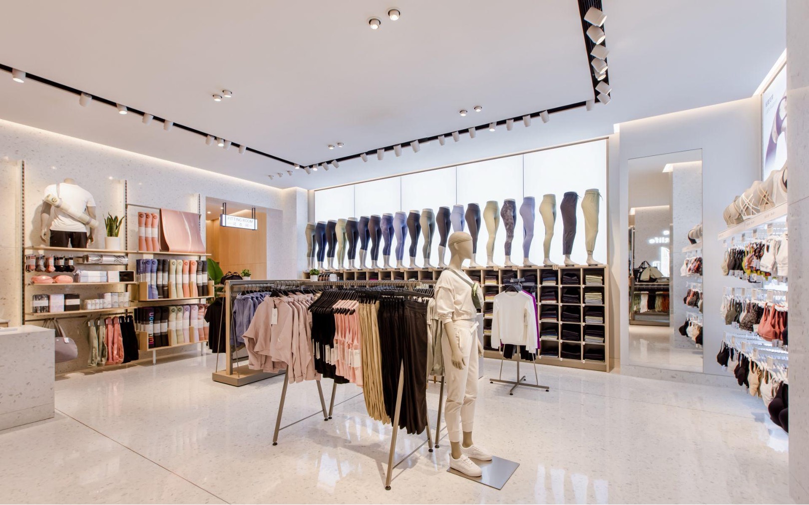 如果你被这项运动吸引了,并觉得自己在伸展时,身上的衣服非常碍手碍脚,你自然就会将目光投向陈列的瑜伽服上——毕竟整个教学场地都被瑜伽服包围,按功能来分区。
