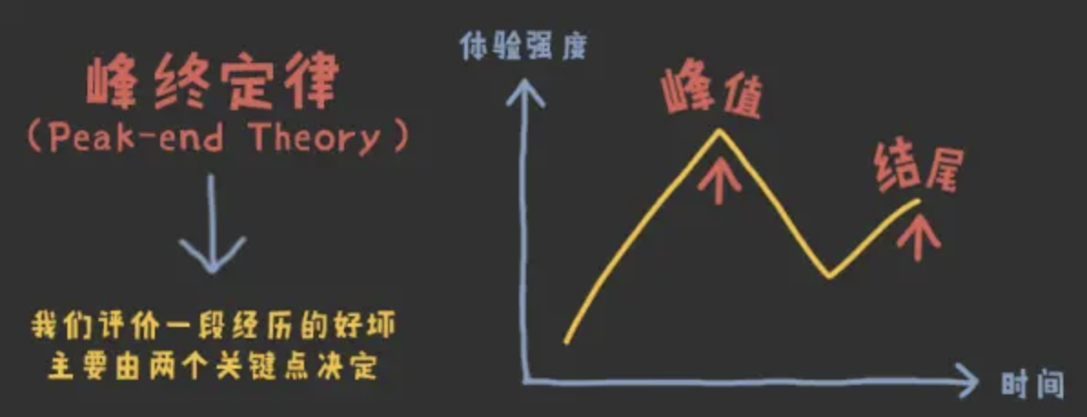 峰终定律(Peak-End Rule)指的是,我们对一段体验的印象由2个时间点的体验决定:过程中的情绪的最高/低点和结束前的最终体验,而整段经历中好坏感受的比重和体验时间长短则影响不大。
