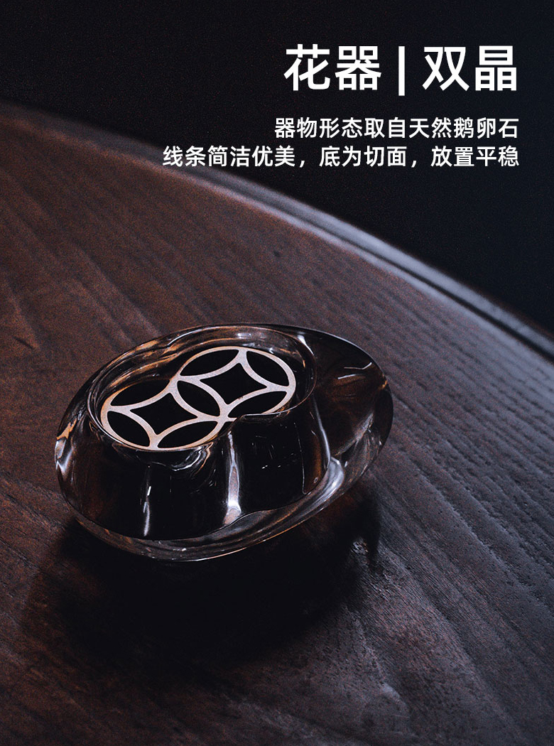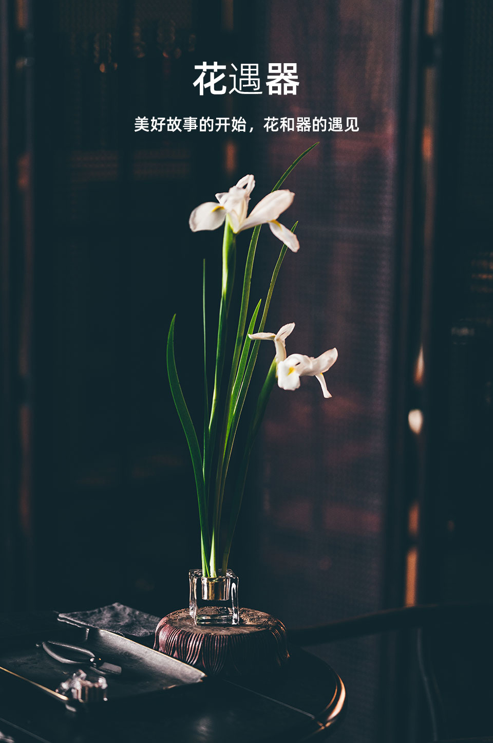 感性的有机线条造型采用透明玻璃材质,赋予器型流动感;理性的方孔圆钱花留自动形成构图框架,可以帮助插花人搭配花材,物尽其用,达成美观与功能的统一。
