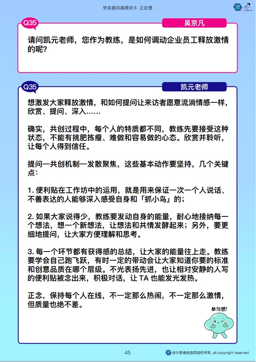 凯元老师在书中回答学友吴京凡的问题:“如何调动员工释放激情?”时,既提到了身为教练该有的态度和工作模式,也解释了行动背后的原因,让学友至少从3个方面获益
