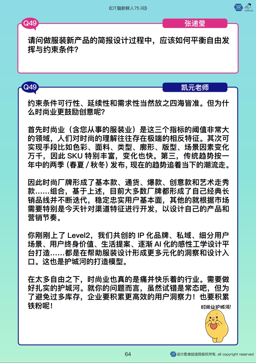 在回答学友张递莹的问题时,提到的内容足见凯元老师对时尚业的理解之深。书中还有涉及珠宝业、保险业、教培业、儿童教育、产品设计等行业的提问,凯元老师依据自己的知识面和实战覆盖面,也都分别针对这些行业的特征及其对应用户进行分析,给出解决方案。